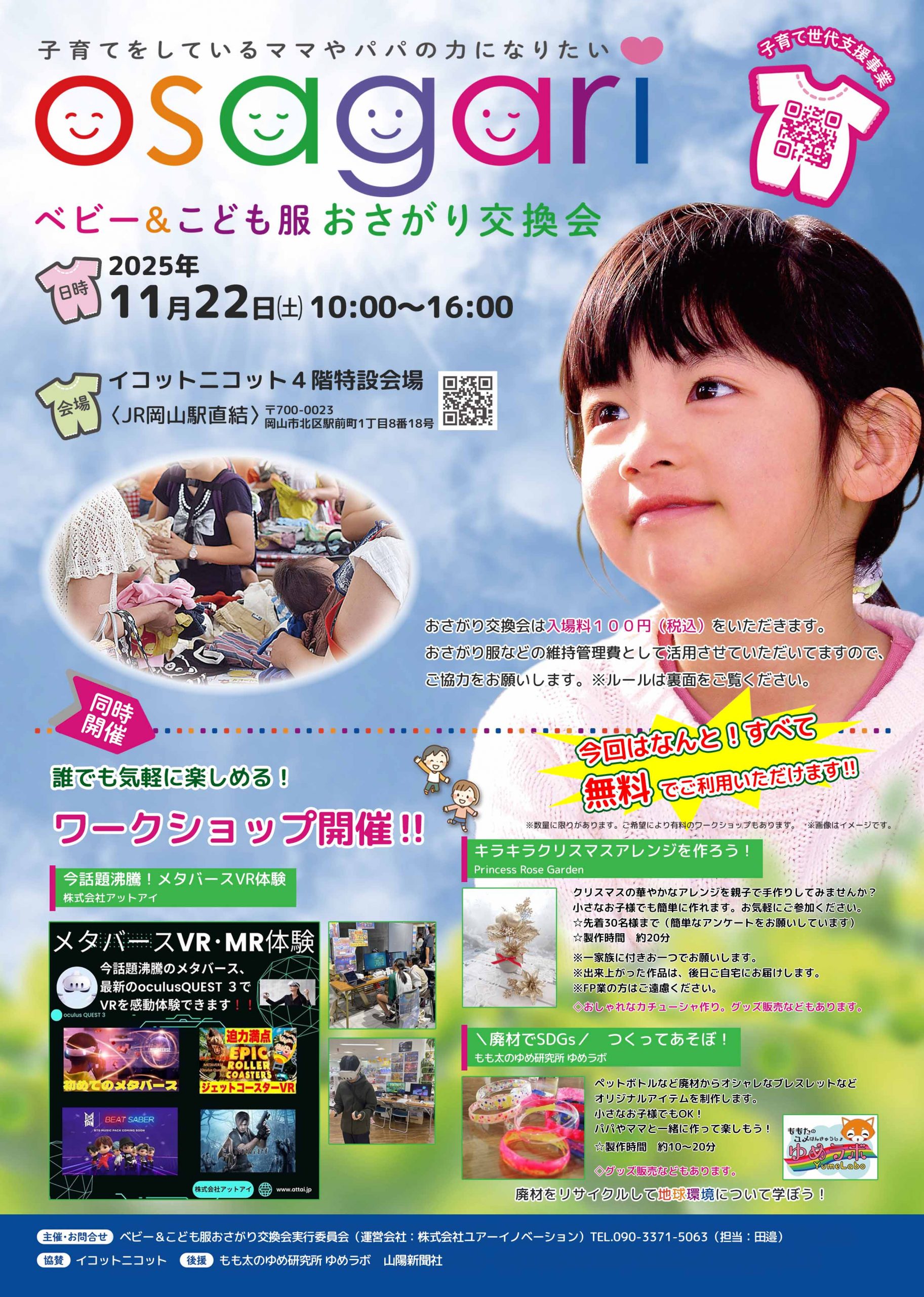 サイズが合わなくなった子ども服を寄せてもらい、必要な人が持ち帰る「ベビー&こども服おさがり交換会」をイコットニコット4階特設会場(岡山市北区駅前町1丁目8番18号)で2025年11月22日(土)10時~16時に開催します。